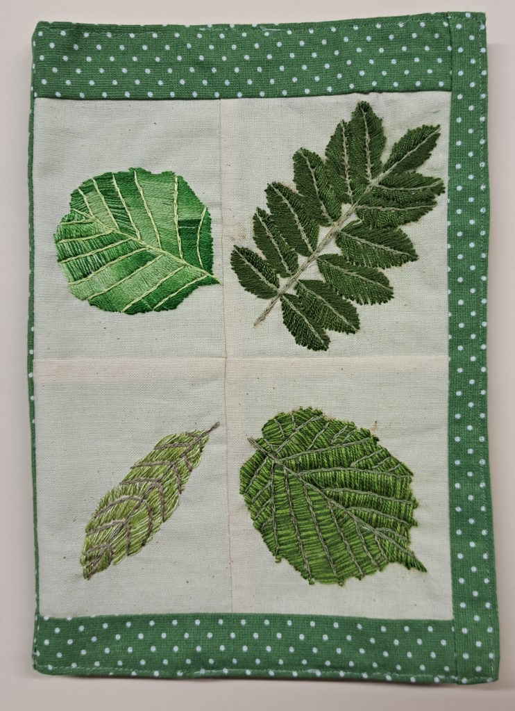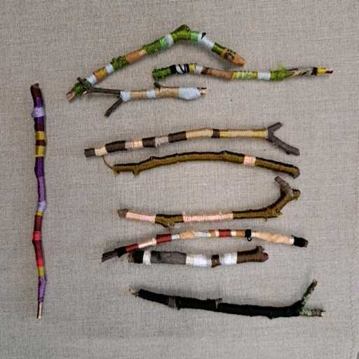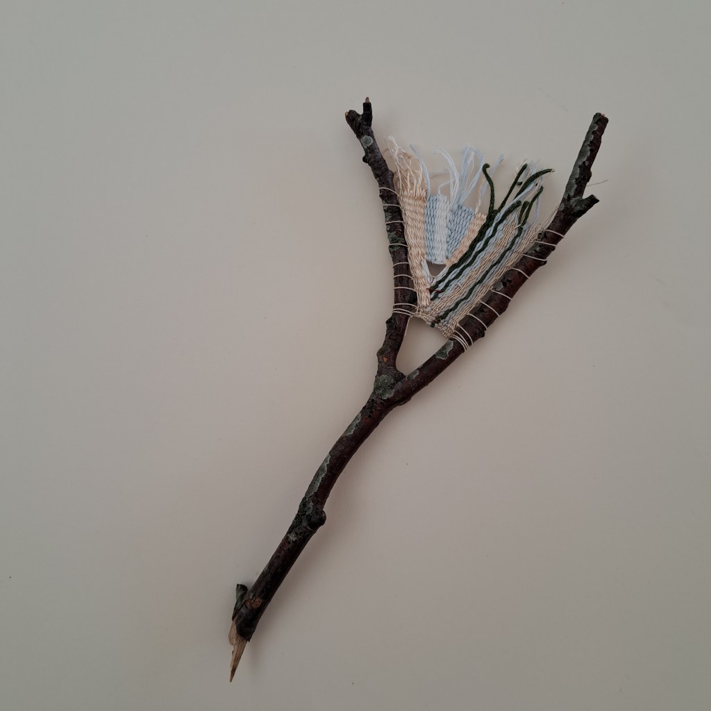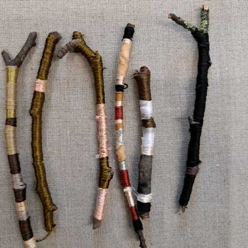 Helen’s fabric and thread dyed with gathered plant materialFabric dyed with gathered plant materialMeg’s expressions in stitch of Climbing Jack fauna.A photograph of a sign found on Tillington CommonWool caught on sticksJo considering shoes