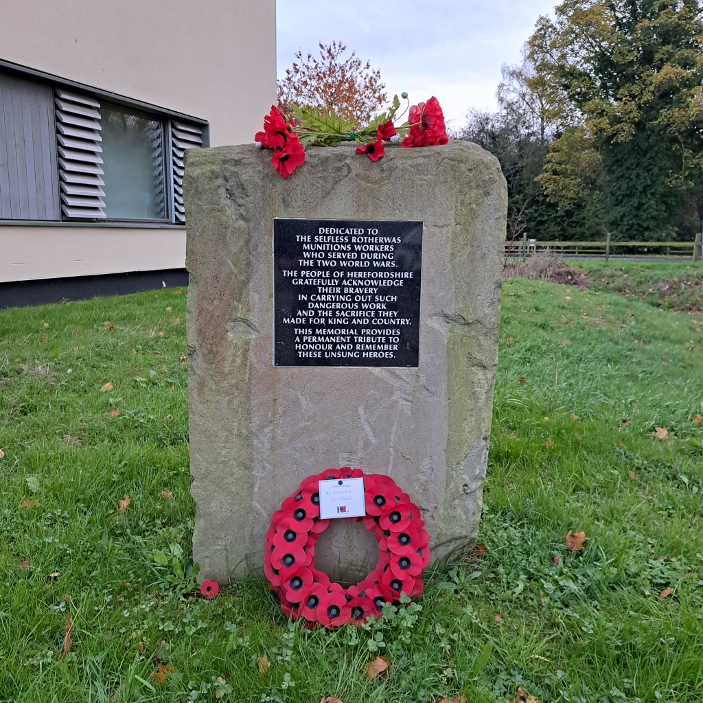 We stopped at 11 a.m. to join the Remembrance commemorative service to the women of Rotherwas who had worked during both World Wars in dangerous conditions in the Munitions Factory close by. The memorial stone is outside HARC.