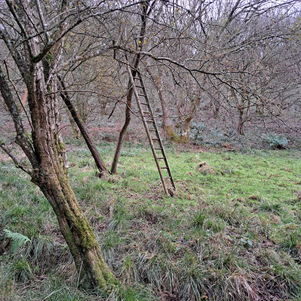 As the hill flattens out, I am strangely delighted to see a wooden ladder leaning up into a tree, and a long length of washing line strung from branch to branch.